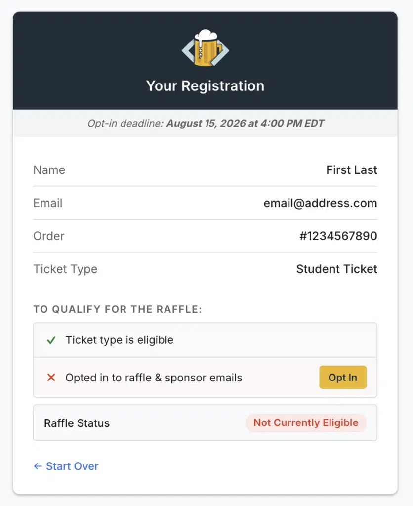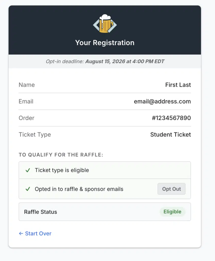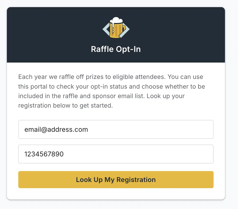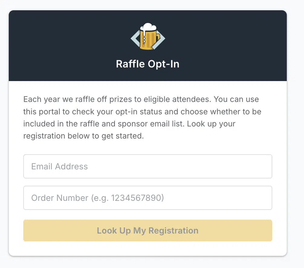 Not everyone registers themselves. Often someone at their company registers them, and opting them in is of no value to that person. With that in mind, we want to have a simple way they can provide identifiable information (their email and maybe their ticket or order number from Eventbrite?...something they would have if they have the ticket) into a web application and see their current opt-in status and eligibility (organizers and vendors aren't eligible, for example). Then, they should be able to change that status up to a certain cut-off datetime, shortly before the drawing.