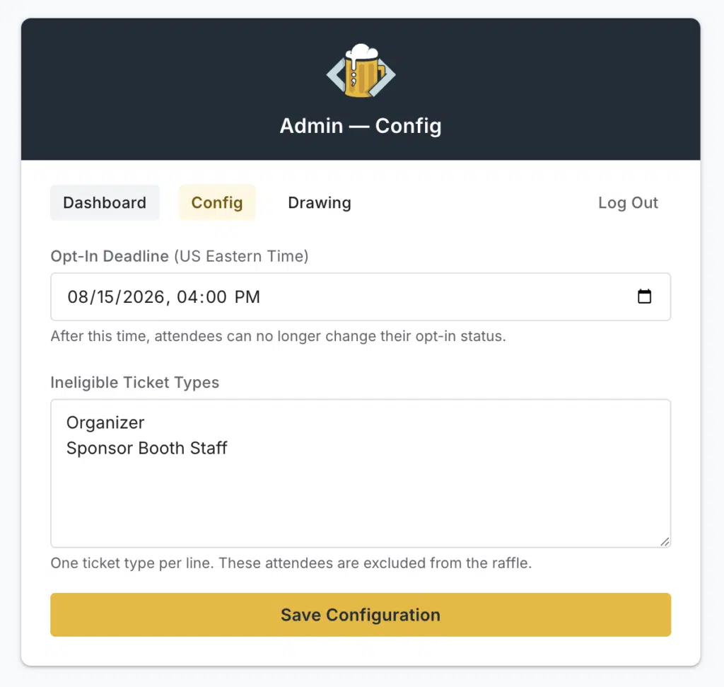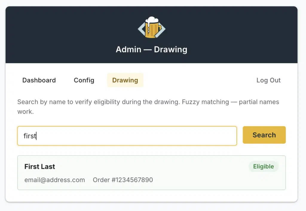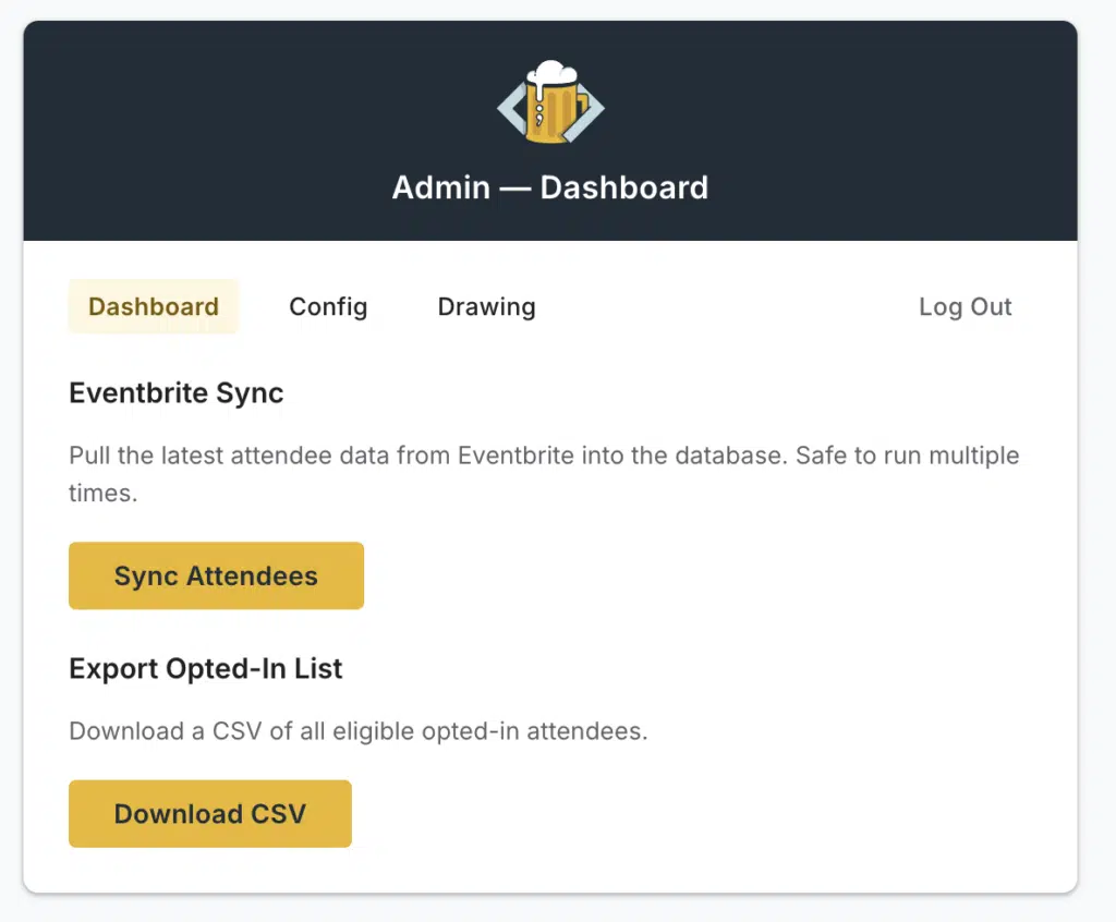 * An admin UI that is accessible to only admins, perhaps just using a secret access code. In the admin UI, you should be able to upload eventbrite tickets as xlsx or csv (uploading the same list multiple times should NOT create duplicates, but only update, add or remove any changes...might be easiest to just delete everything and reprocess the upload), set a datetime when the ability to change opt-in status is locked down, a drawing UI that checks someone's eligibility and opt-in status by name (should fuzzy match if it's not spelled right or only part of the name)