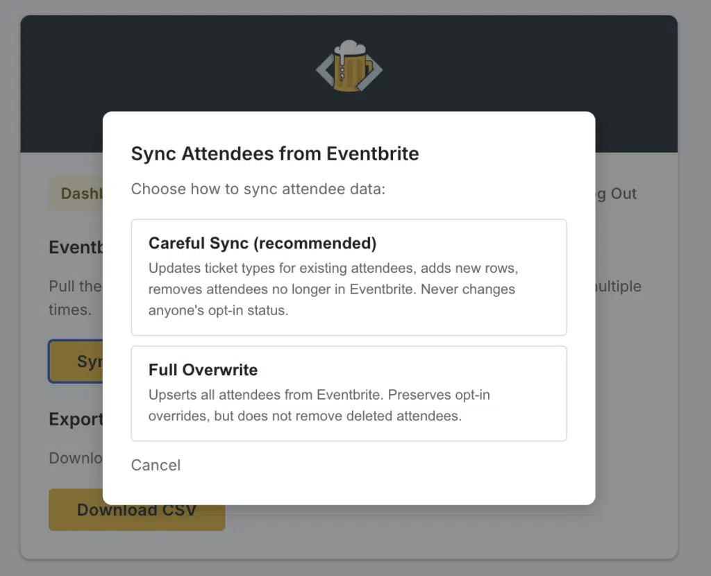 If I was going to do it this way, I wanted to include everything on my wishlist, not just an MVP (minimally viable product). With that in mind I decided to include not just the attendee eligibility lookup and the ability to manage one’s opt-in status, but also an admin dashboard, automatic Eventbrite data synchronization, and a raffle drawing UI.