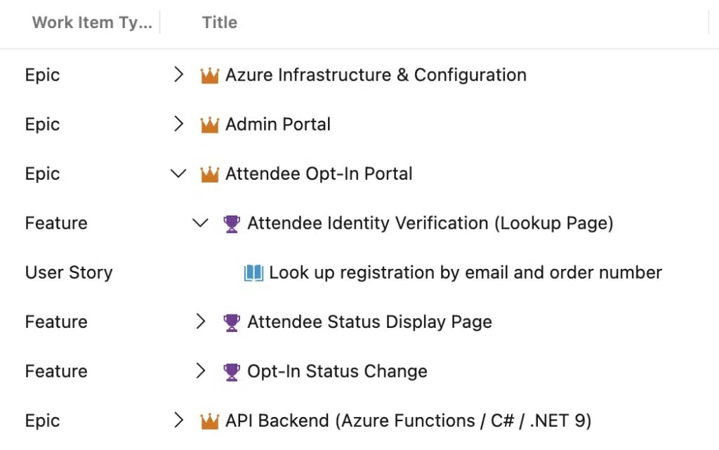 I knew Claude had an MCP server connection to the event’s Azure DevOps account. With that, the specs didn’t just get exported to a Word document, markdown, or need to be copy-and-pasted. Instead I told Claude to create the specs as live work items directly in the ADO project. Claude created 4 Epics, 12 Features, and several user stories with well-defined acceptance criteria. By the end of the session, there was an actual backlog in Azure DevOps that Claude Code could reference by story number. In a real-world project with a whole team, this allows the whole team, AIs and people, to grab tasks from the backlog and collaborate.