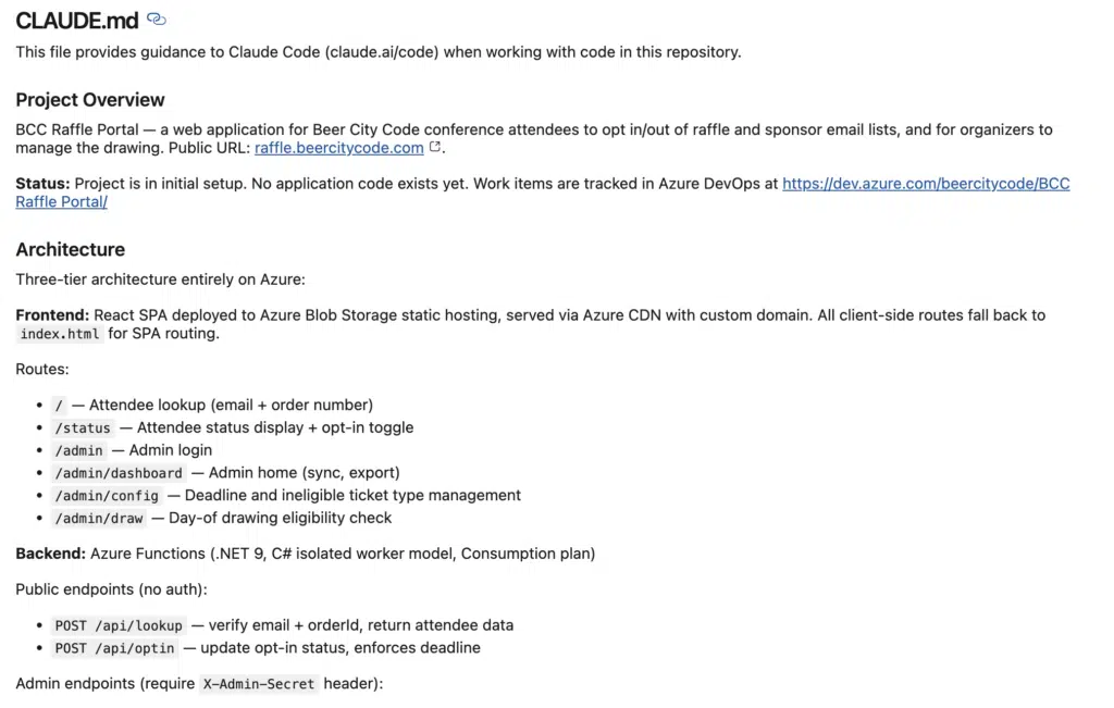 The CLAUDE.md file was the other half of the handoff. This is the file Claude Code reads automatically when you start a session in a repo. It’s how context transfers from one AI instance to another. The chat session built the spec. The CLAUDE.md captured the architecture, data model, Eventbrite field names, eligibility rules, API shape, and environment config all in one place.