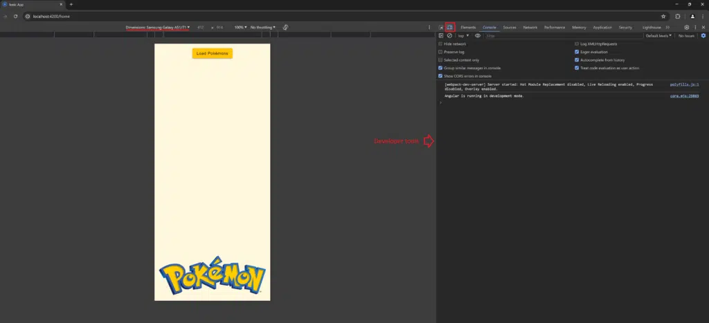 4. Press F12 in the browser to open the Developer Tools, and select the option to display as a mobile device.