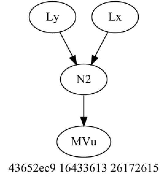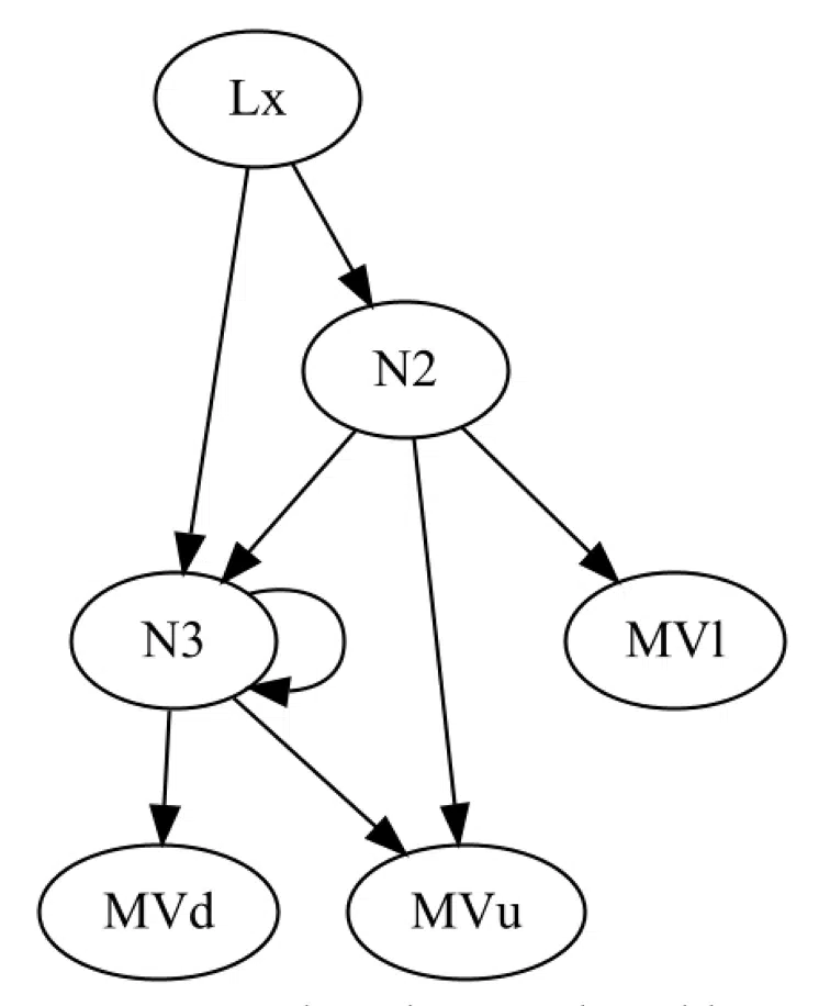 Here’s a random neural network for a creature with two genes (each gene defines a connection between two neurons). It has two input neurons whose outputs depend on the X and Y axis positions, one internal neurons(think of them as aggregators), and one output neuron allowing it to move up.