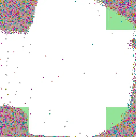 In this blog post we will simulate an evolution of creatures that start with random genes, and over time evolve to survive in a world where only the corners of the map promote reproduction. They will essentially learn to do this: