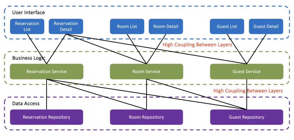 As features are implemented, different layers need to interact with each other. This interaction often leads to code-sharing and dependencies between layers, which can create tight coupling across layers of the application. A change in the data access layer might require updates in the business logic layer, which in turn might impact the presentation layer. This interconnectedness can make it difficult to modify one part of the application without unintentionally affecting others.