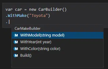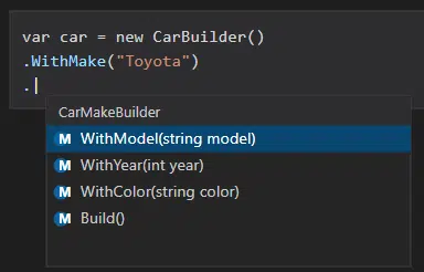 The IntelliSense support becomes a powerful feature of this pattern. After setting properties, only the remaining options are available, preventing duplicate assignments at compile time. Notice these samples: