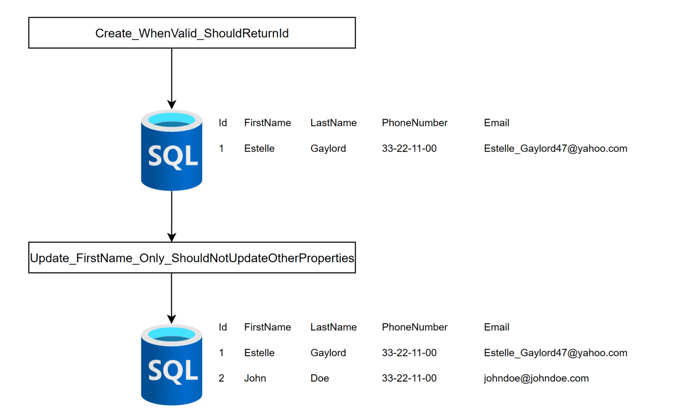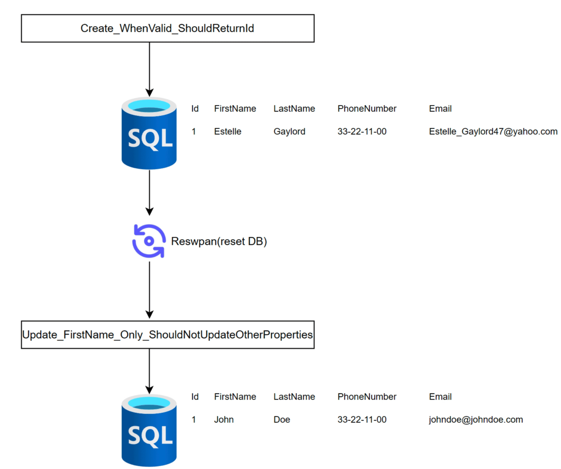 Now that we have a better understanding, it’s clear why the test ‘Create_WhenValid_ShouldReturnId’ results in the database being in a ‘dirty’ state. The database is not in a clean state after this test, and the test ‘Update_FirstName_Only_ShouldNotUpdateOtherProperties’ relies on the database being in a clean state for its execution.
