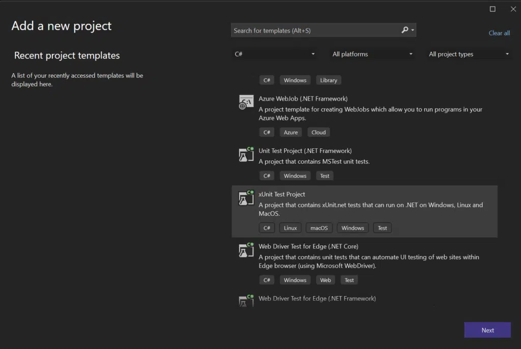Once we’ve successfully created the XUnit project, we’ll need to add a few NuGet packages to our project: